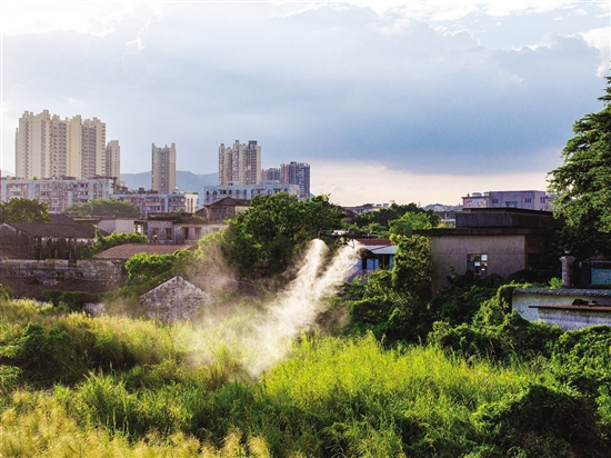开平市塘口镇通过多种方式应用烟雾机灭蚊。图为烟雾机搭配农用车对蚊虫进行灭杀。